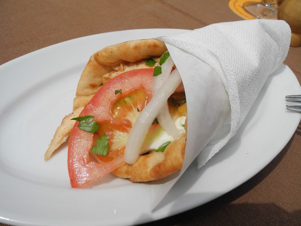 Souvlaki (apola)- Grška hitra prehrana, ploski kruh, meso, omaka, zelenjava + krompirček (z vsem). Souvlaki je lahko: